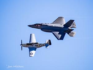 A WWII era P-51 flying next to a F-35 5th generation fighter.