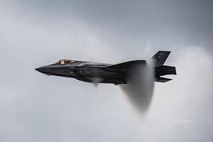 Shockwaves surrounding a fighter jet on a high speed pass.
