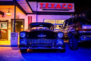 1956 classic hot rod in blue light at a service station.