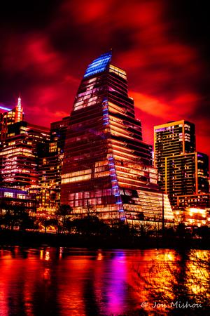 A long exposure shot of the Sailboat building, edited to express a dark fantasy version of Austin, TX.